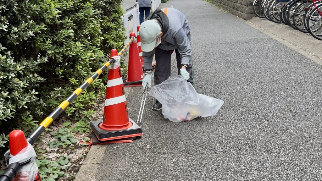 ゴミ袋、軍手、ゴミはさみ等は準備され、各区分に別れて清掃を行う。